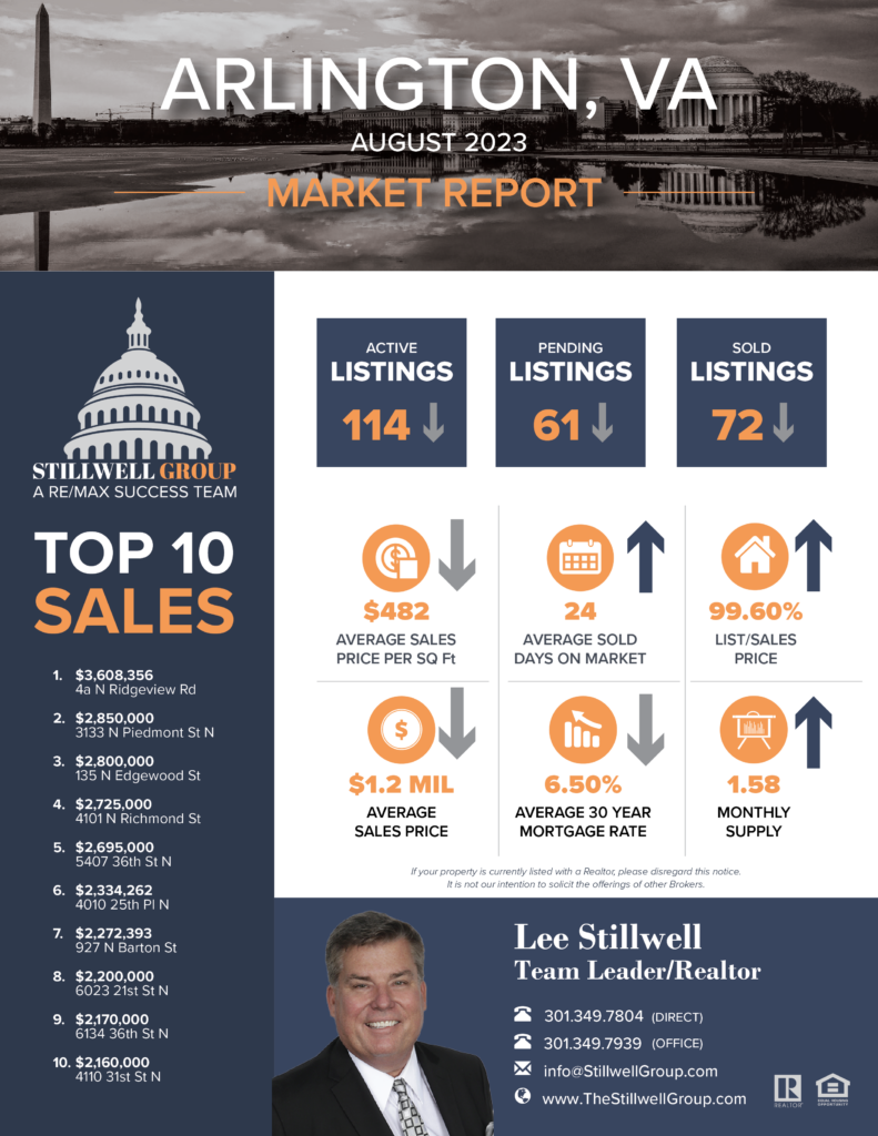 According to Bright MLS, the marketplace for Arlington, VA residential properties, here’s what happened in August Vs July 2023: