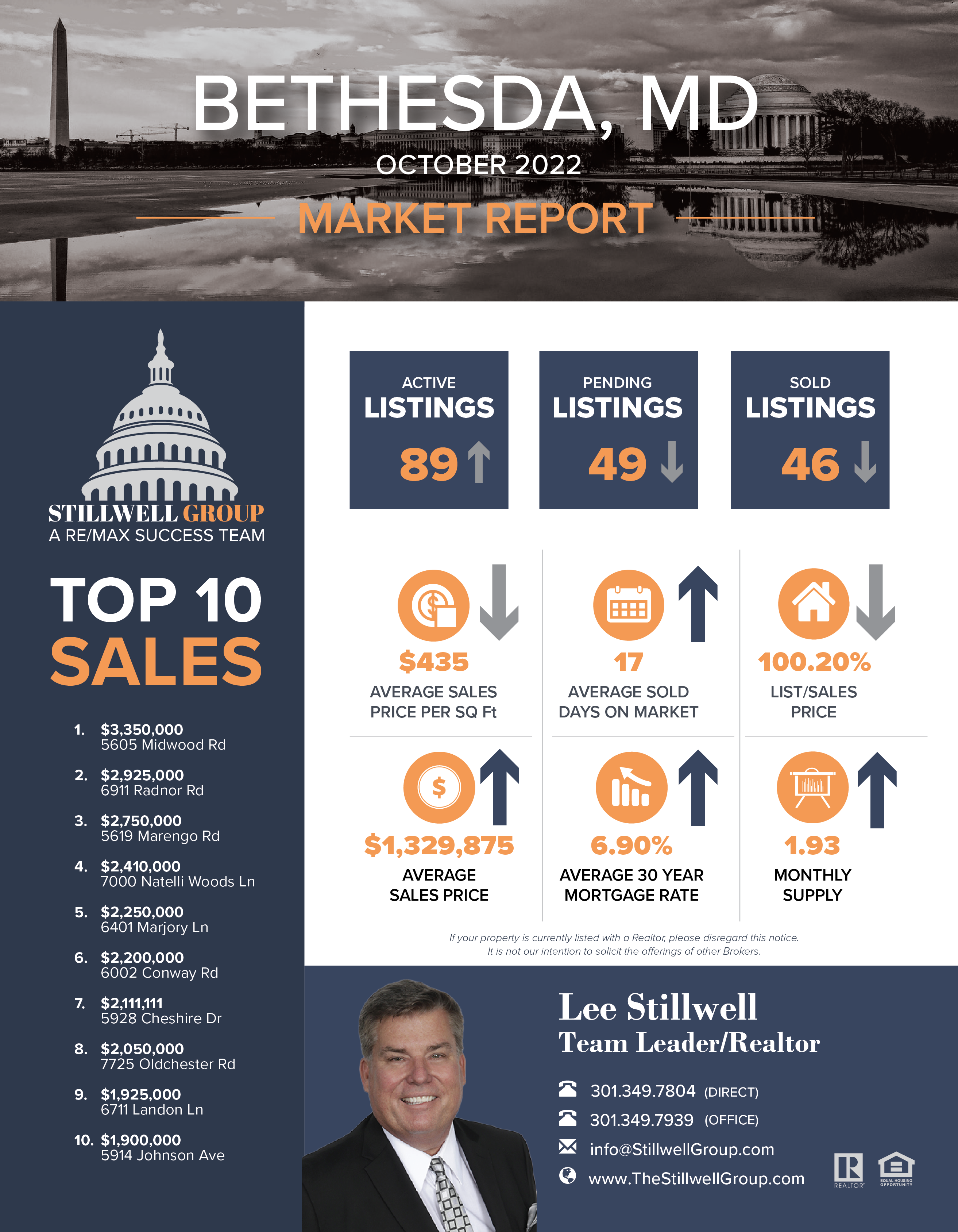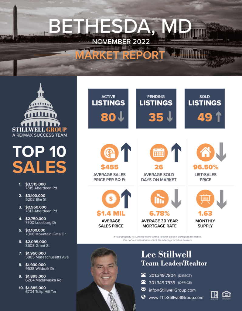 Welcome to the Stillwell Group Market Update. I’m Lee Stillwell. If you’re thinking about buying or selling residential real estate, it’s important to understand the current market trends according to Bright MLS, the marketplace for Bethesda Residential Properties. Here’s what happened in October of 22 versus October of 21, the number of sold properties decreased 45% to 46 properties with a top sale of 3.35 million in Millwood Road in Bethesda. The average sales price increased 15% to 1.3 in the average price per square foot. Decrease to $435. Inventory of the properties available for sale measured in months. Applied increase, 146%. Going to two months worth of properties for sale. The average 30 year fixed mortgage increase to an average rate of 6.9 according to Freddiemac.com, the market continues to show signs of slow. and big jump in inventory. This indicates a clear shift in the market presents an opportunity for buyers heading into the latter part of this year. If you think about buying or selling residential real estate now or in the near future, it is important to seek a guidance of a vice of a professional real estate agents. Thanks for tuning in. We’ll see you soon. The Stillwell Group Market Update.