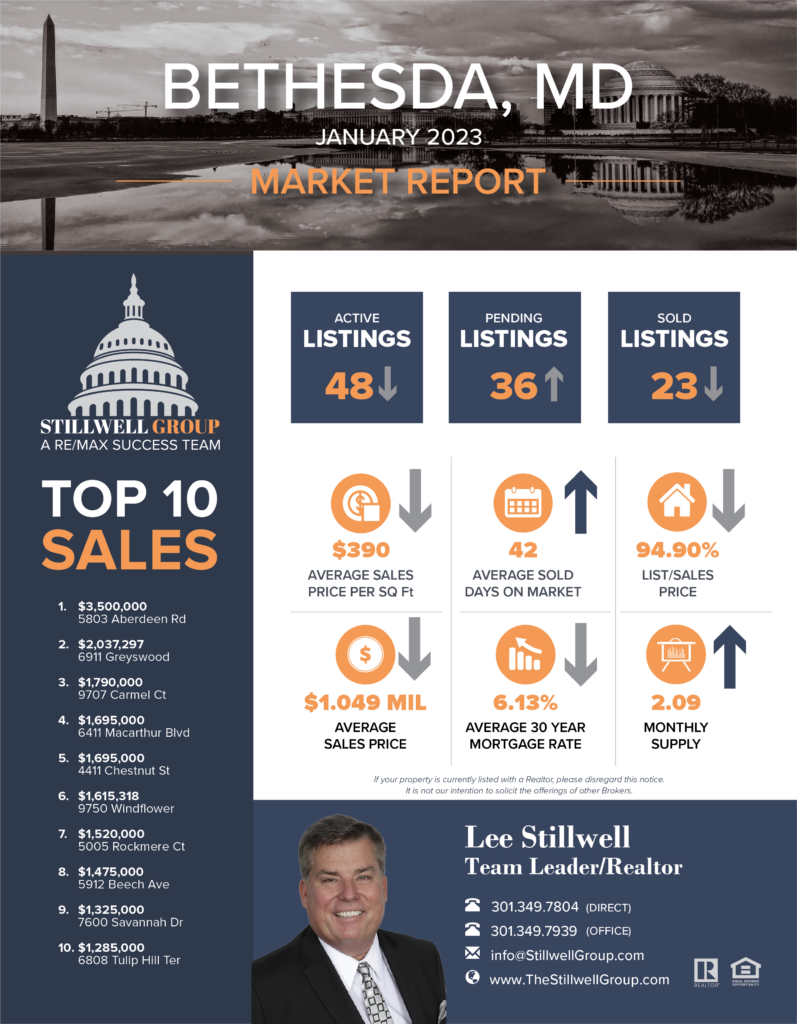 According to Bright MLS, the marketplace for Bethesda, MD residential properties, here’s what happened in January 2023 Vs December 2022: