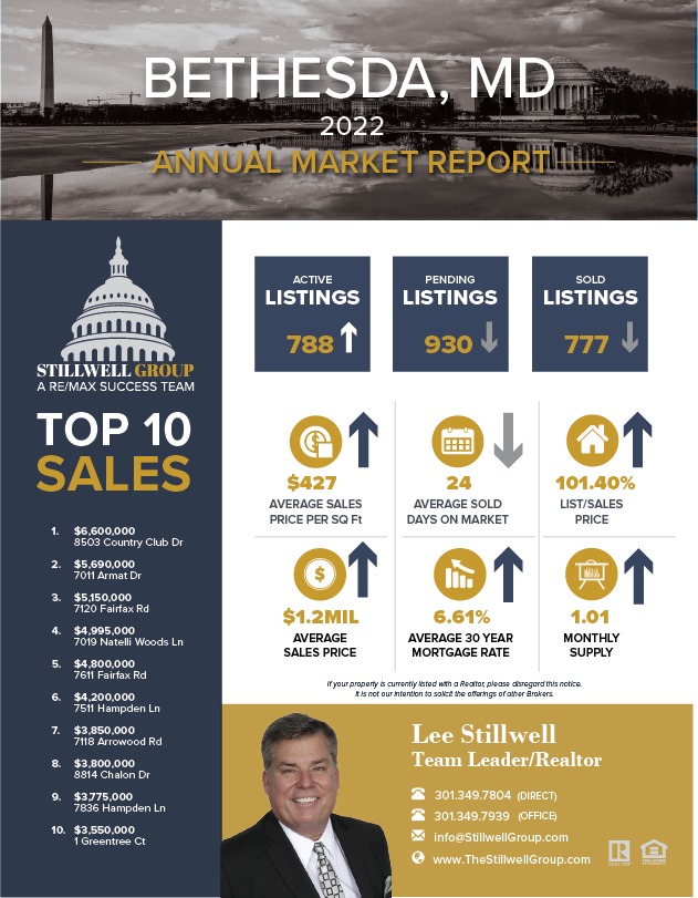 According to Bright MLS, the marketplace for Bethesda, MD residential properties, here’s what happened in the Year 2022 versus 2021: