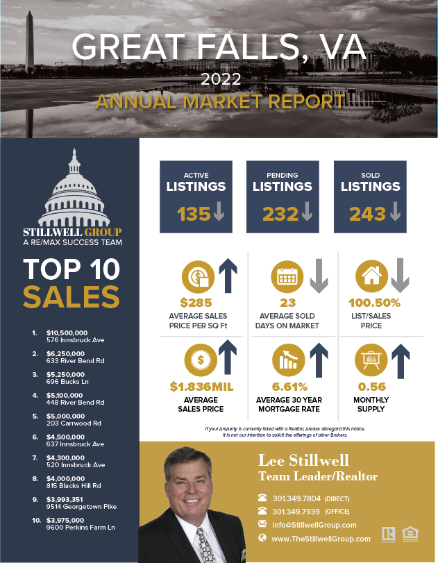According to Bright MLS, the marketplace for GREAT FALLS, VA residential properties, here’s what happened in the Year 2022 versus 2021:
