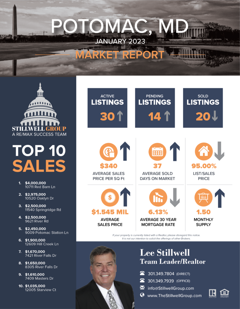 According to Bright MLS, the marketplace for Potomac, MD residential properties, here’s what happened in January 2023 Vs December 2022: